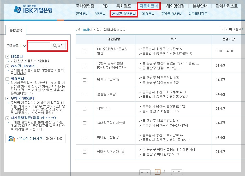 ATM도 인출이나 입금을 위해 많이 사용하시죠. 역시 위의 링크를 클릭하시고 들어가시면 됩니다. 링크에 들어가셔서 아래 빨간 박스처럼 '자동화 코너', '24시간 365 코너' 혹은 그 옆의 '365 코너' 등을 들어가신 후 원하시는 지역명을 입력하여 검색하시면 ATM 위치를 검색하실 수 있습니다.