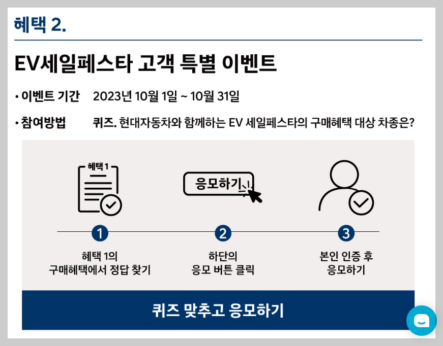 위 할인뿐만 아니라 현대자동차에서는 EV세일페스타를 통해 23년 연말까지(보조금 소진 시까지) 구매 혜택을 제공하고 있습니다.