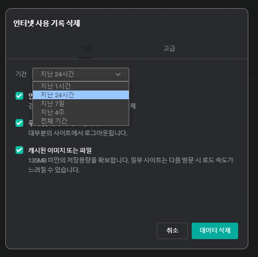 5. 그럼, 아래와 같이 기록 삭제에 대한 옵션이 생성되는데요, 기간과 어떤 항목을 삭제하여 줄지 선택 후 데이터 삭제를 클릭합니다. 저는 지난 24시간을 선택하여 데이터 삭제해 보았습니다.