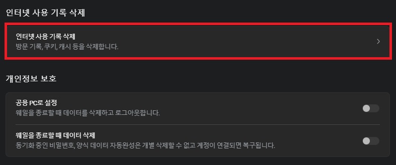 4. 이후, 인터넷 사용 기록 삭제 버튼을 클릭해 줍니다. 간단하지요?