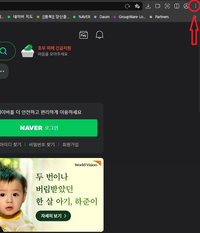 2. 위의 사진처럼 우측 상단 점 세 개 아이콘을 클릭하시면 설정 버튼이 보입니다. 클릭해 주세요. 웨일 외에도 쿠글의 크롬이나 마이크로소프트의 엣지 웹브라우저도 비슷한 위치와 방식이니 참고해 주세요.