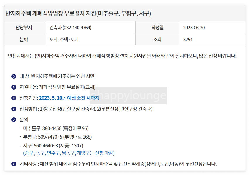 강서구뿐만 아니라 다른 지역에서도 신청하실 수 있는데요 인천광역시도 개폐식 방범창 설치 사업을 하고 있습니다. 그 외 자신이 소유한 주택 등이 있는 소재지의 시청에 문의하시거나 홈페이지를 통해서 정보를 찾아보시면 방범창 설치 사업 유무에 대한 소식을 보실 수 있을 겁니다.