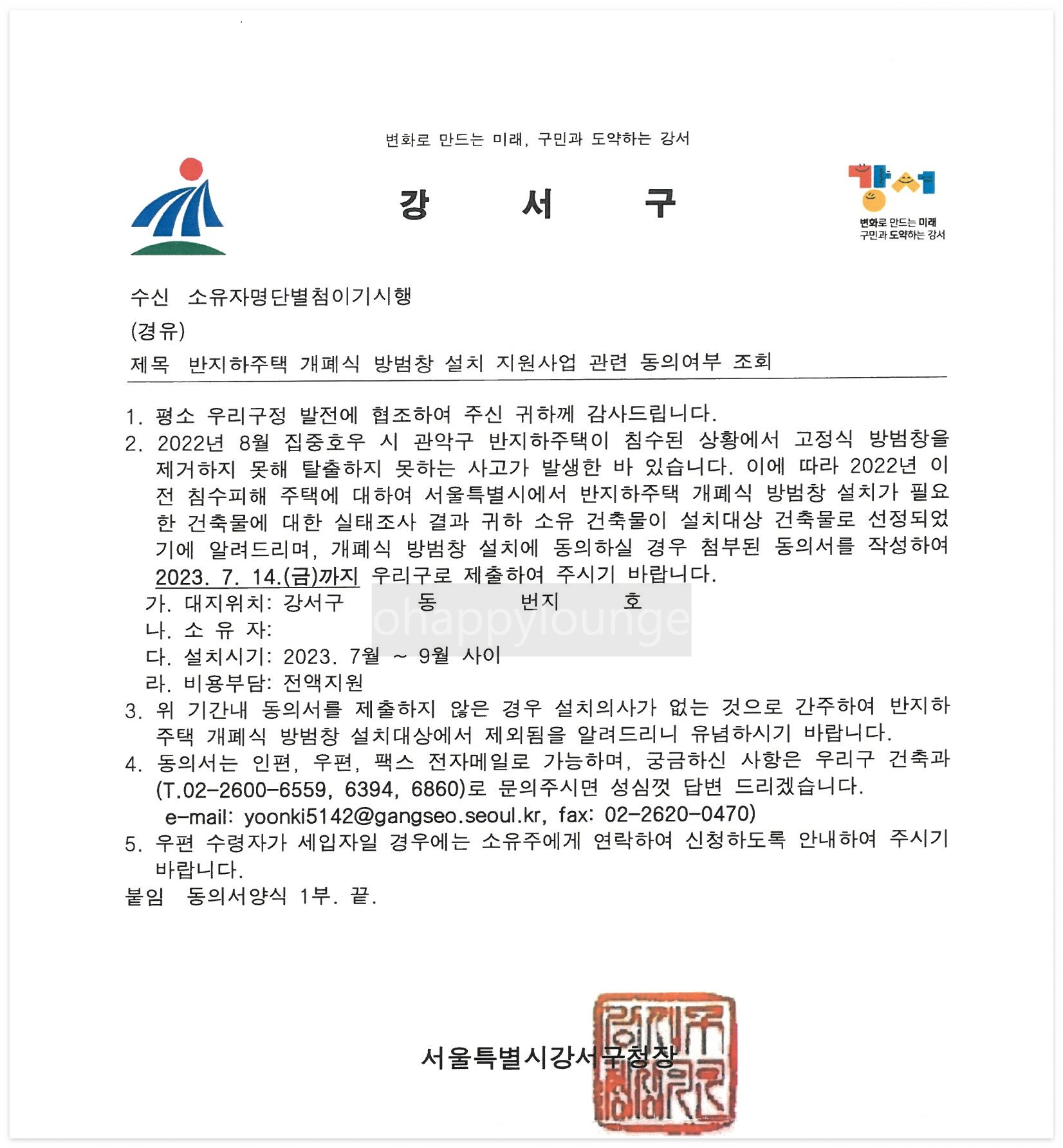 개폐식 방범창 설치는 각 구청 등 지자체를 통해 신청하실 수 있습니다. 저는 강서구청을 통해 개폐식 방범창 설치 사업 소식을 듣게 되었는데요, 아래 같은 우편물을 수령하였습니다.