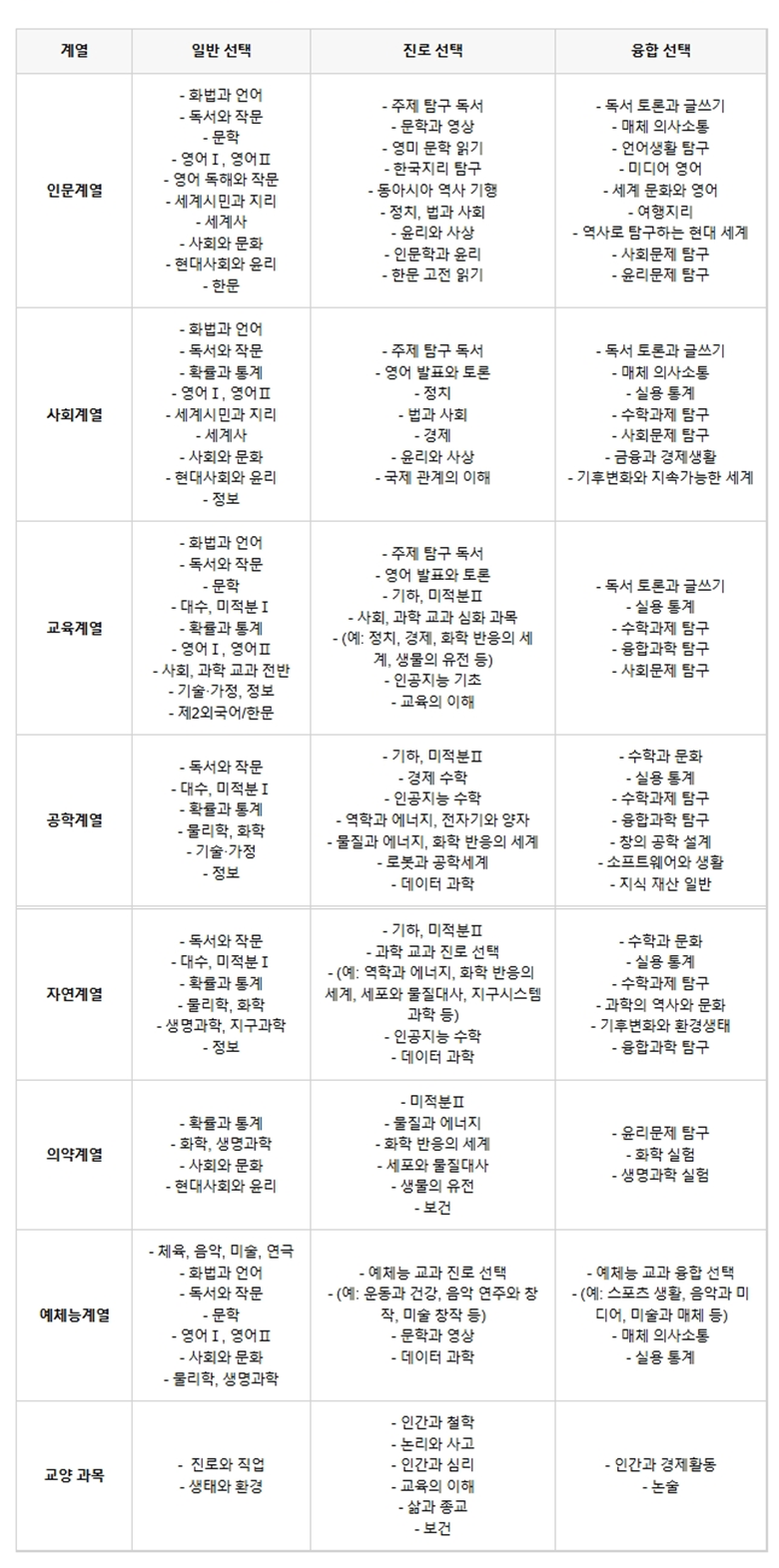 그럼, 오늘의 주제인 고교학점제의 선택과목별 종류를 표로 한눈에 보실 수 있는 총정리 자료를 공개합니다. 아래 자료는 각 대학 학과의 계열별 종류입니다. 여기서 고등학교 고교학점제 과목을 선택하시면 되세요.