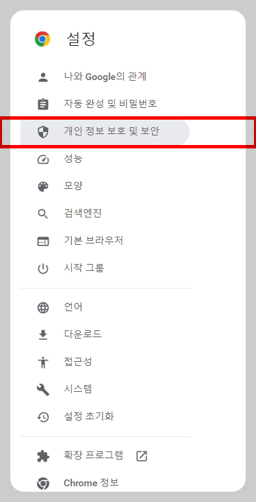 3. 그러면 좌측에(위 까지는 우측이고 여기서부터 좌측 메뉴입니다.) 설정 메뉴가 구체적으로 나오는데요. 여기서 개인 정보 보호 및 보안 버튼을 클릭해 줍니다.