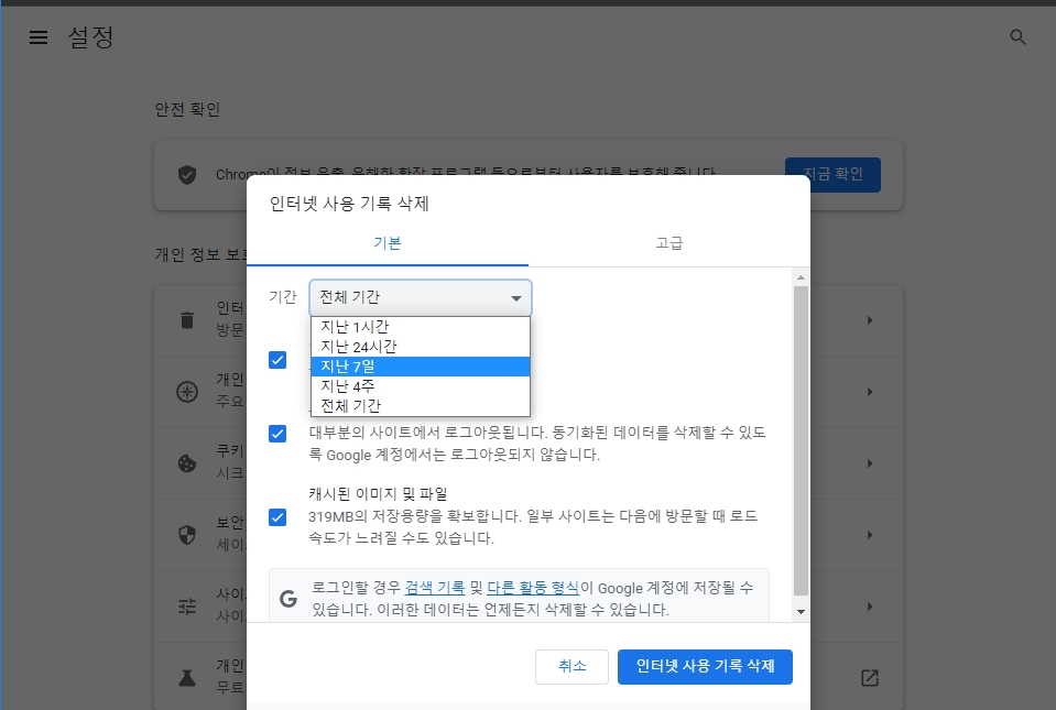 5. 그러면 아래와 같이 기간을 설정하게 되는데 원하는 기간을 설정하시고 삭제 버튼을 클릭해 줍니다. 저는 지난 7일을 선택해 보겠습니다.