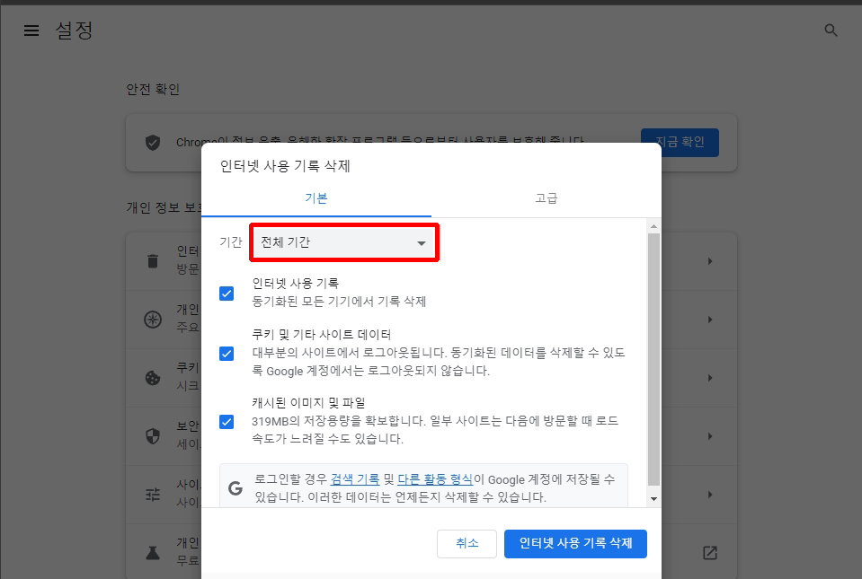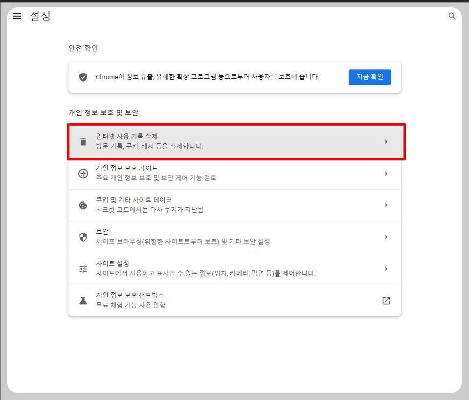 4. 개인 정보 보호 및 보안 버튼을 클릭하면 아래 우측과 같은 메뉴가 뜨게 되는데 여기서 인터넷 사용 기록 삭제 버튼 클릭.