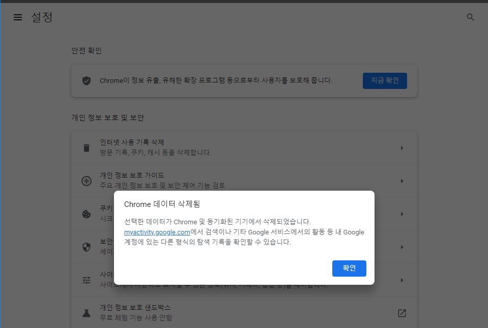 6. 간단하지요. 다 되었습니다. 아래와 같이 크롬 데이터가 삭제된 것을 볼 수 있습니다. 이렇게 구글 크롬 인터넷 삭제 방법과 삭제 해야 하는 이유를 모두 알아보았습니다. 수고하셨습니다!