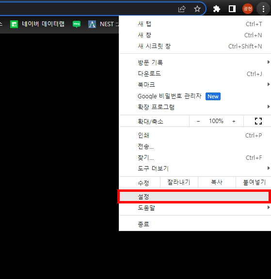 2. 그러면 아래와 같이 메뉴가 뜨는데요, 설정 버튼을 눌러줍니다. 크롬 외에 다양한 웹브라우저도 비슷한 경로로 진행됩니다. 참조해 주세요.