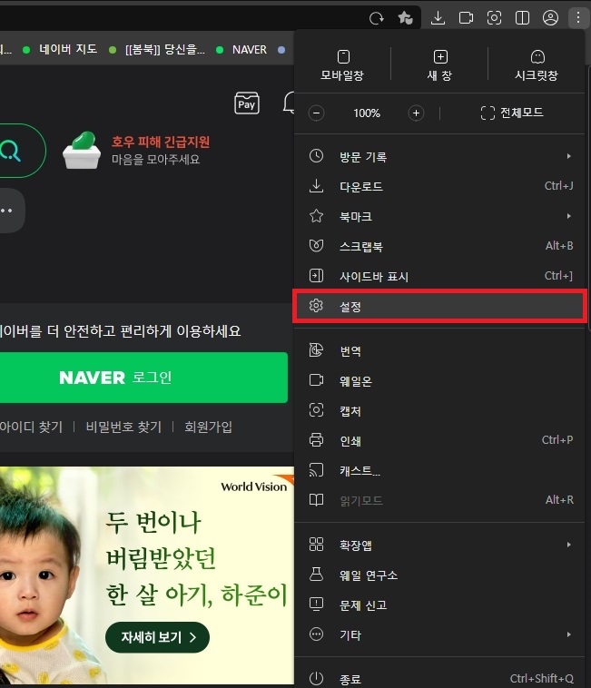 2. 위의 사진처럼 우측 상단 점 세 개 아이콘을 클릭하시면 설정 버튼이 보입니다. 클릭해 주세요. 웨일 외에도 쿠글의 크롬이나 마이크로소프트의 엣지 웹브라우저도 비슷한 위치와 방식이니 참고해 주세요.