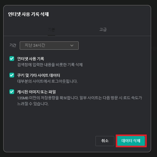 5. 그럼, 아래와 같이 기록 삭제에 대한 옵션이 생성되는데요, 기간과 어떤 항목을 삭제하여 줄지 선택 후 데이터 삭제를 클릭합니다. 저는 지난 24시간을 선택하여 데이터 삭제해 보았습니다.