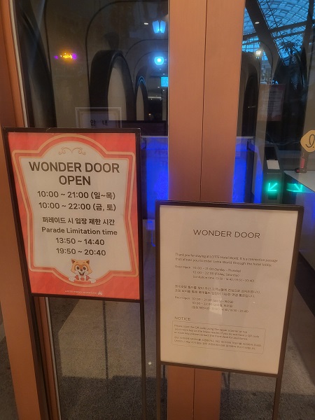 이렇게 유익하고 정갈했던 리더스포럼 조찬회 롯데호텔 월드의 크리스탈 볼룸 및 조식 후기를 남겨보았습니다. 끝으로, 롯데호텔 월드에서 숙박하며 롯데월드를 방문하게 되면 누릴 수 있는 원더도어도 둘러보았는데요. 1층 로비 뒤편에 이렇게 롯데월드로 이어지는 원더도어를 볼 수 있습니다. 오픈 시작인 10시보다 15분 일찍 입장할 수 있는 특혜가 있는 거 알고 계시죠? 인기 어트렉션을 누구보다 빨리 탑승할 수 있어서 좋답니다. 오늘은 저에게 그림의 떡이니 다음 기회에 누려보아야겠어요.