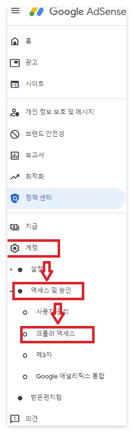 이번에는 왼쪽 메뉴 탭에서 [계정 - 액세스 및 승인 - 크롤러 액세스] 순으로 들어가 줍니다. 이제부터 문제 해결 시작입니다.