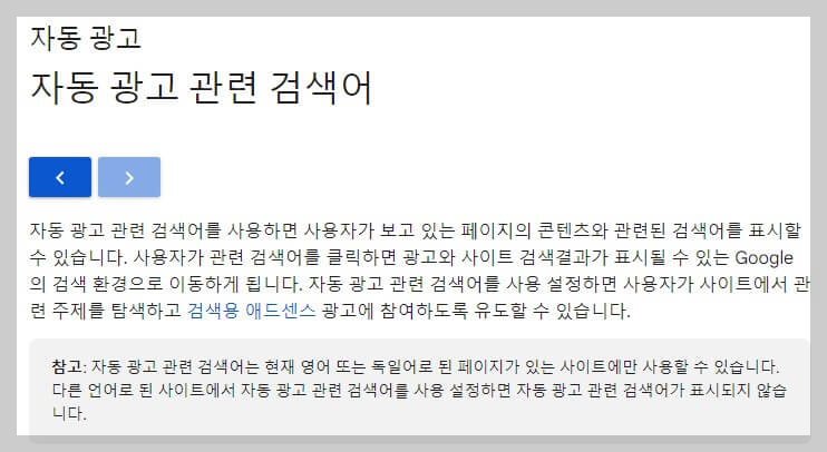 현재 자동 광고 관련 검색어는 영어 또는 독일어로 된 페이지가 있는 사이트에만 사용됩니다. 한국에서도 북미 등 영어권 나라나 독일을 타깃 하는 사이트이시라면 자동 광고 관련 검색어가 적용되겠습니다. 아래 내용 참고해 보시기 바랍니다.