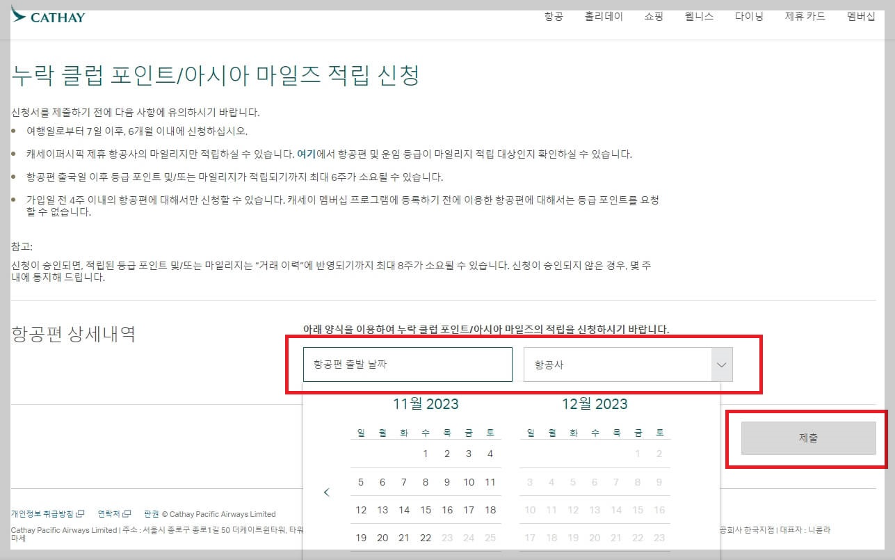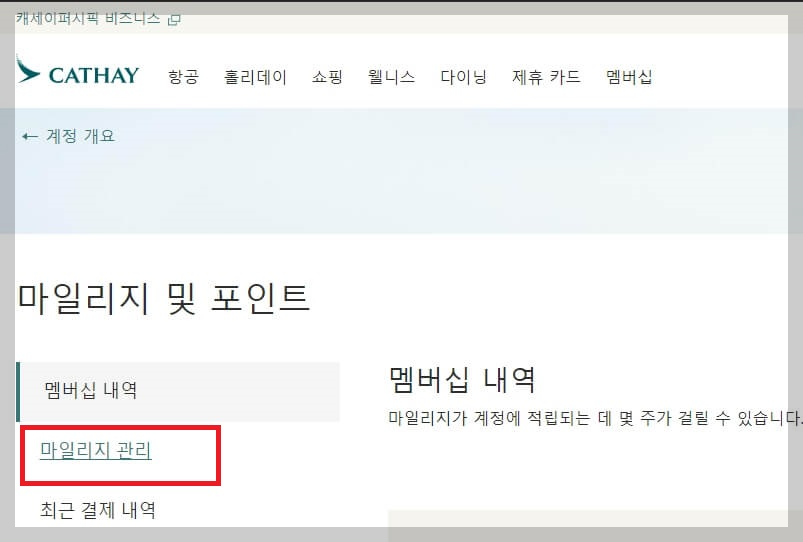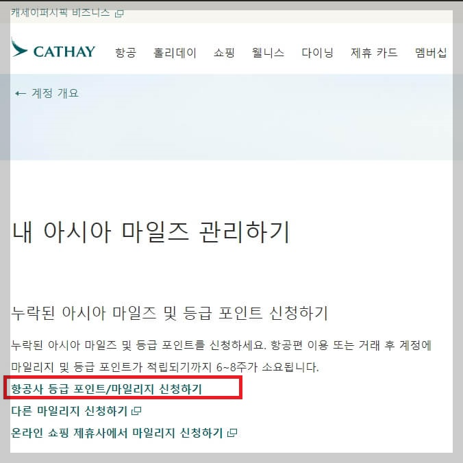 - 캐세이퍼시픽 항공 마일리지 적립은 여행일로부터 7일 이후, 6개월 이내 신청하여야 합니다.