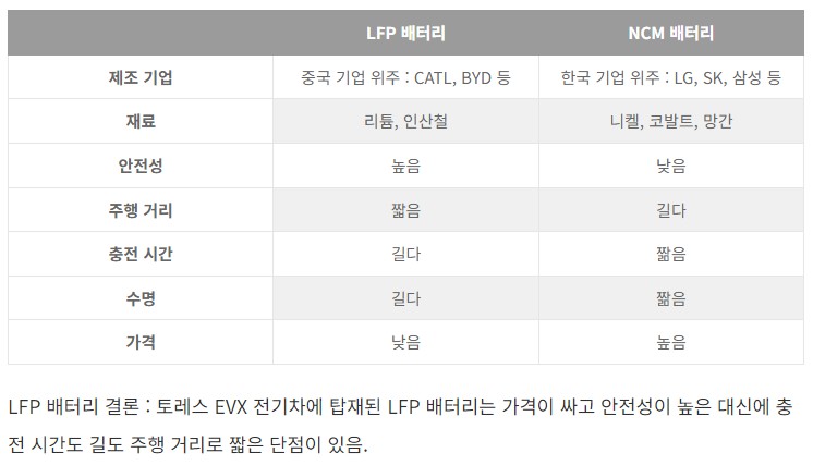 캐스퍼에 적용될 LFP 배터리는 어떤 장단점이 있을까요? 기존 국내 생산되던 NCM 배터리는 기아의 EV6, EV9, 현대의 아이오닉, 제네시스 전기차 등에 사용되어 왔습니다. NCM대비 LFP배터리는 안전성도 높고 수명도 긴 장점이 있지만 배터리의 생명인 주행거리가 짧고 충전 시간이 길다는 치명적인 단점이 있습니다. 하지만 가격이 상대적으로 낮아서 기아 레이 전기차나 캐스퍼, 그리고 KG모빌리티의 토레스 전기차 등에 적용될 전망입니다.