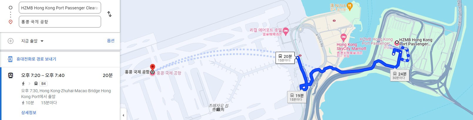 이번에는 홍콩 공항에서 버스를 통해 바로 마카오로 이동하는 비용 및 시간을 알아보겠습니다. 이동 경로가 조금 복잡해 보일 수 있습니다. 우선 공항에서 HZMB 홍콩 포트로 이동해야 합니다. 공항 도착장에서 나오셔서 B4버스를 타고 가시면 되시며 버스 대시기간이 15분. 타이밍이 좋아야 해요!