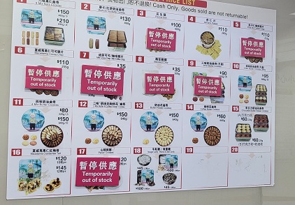 가격은 조금씩 바뀐다고 합니다. 하지만 과거 다른 블로그를 통해 봤을 때 그렇게 변동되는 것 같지는 않습니다. 작은 제품은 80 홍콩달러(14,000원 수준)에서 큰 제품은 150 홍콩달러(25,500원 수준) 하는 것으로 보입니다. 적당한 가격과 예쁜 케이스. 그리고 보증된 맛으로 여행 선물로 인기 있는 이유가 있습니다. 특히 인기 많은 11번 상품의 경우 재고를 산더미 같이 쌓아놓고 판매하고 있었어요. 10시 오픈이지만 오후 늦게 가지 않는 이상 재고 걱정은 안 하셔도 될 것 같습니다.