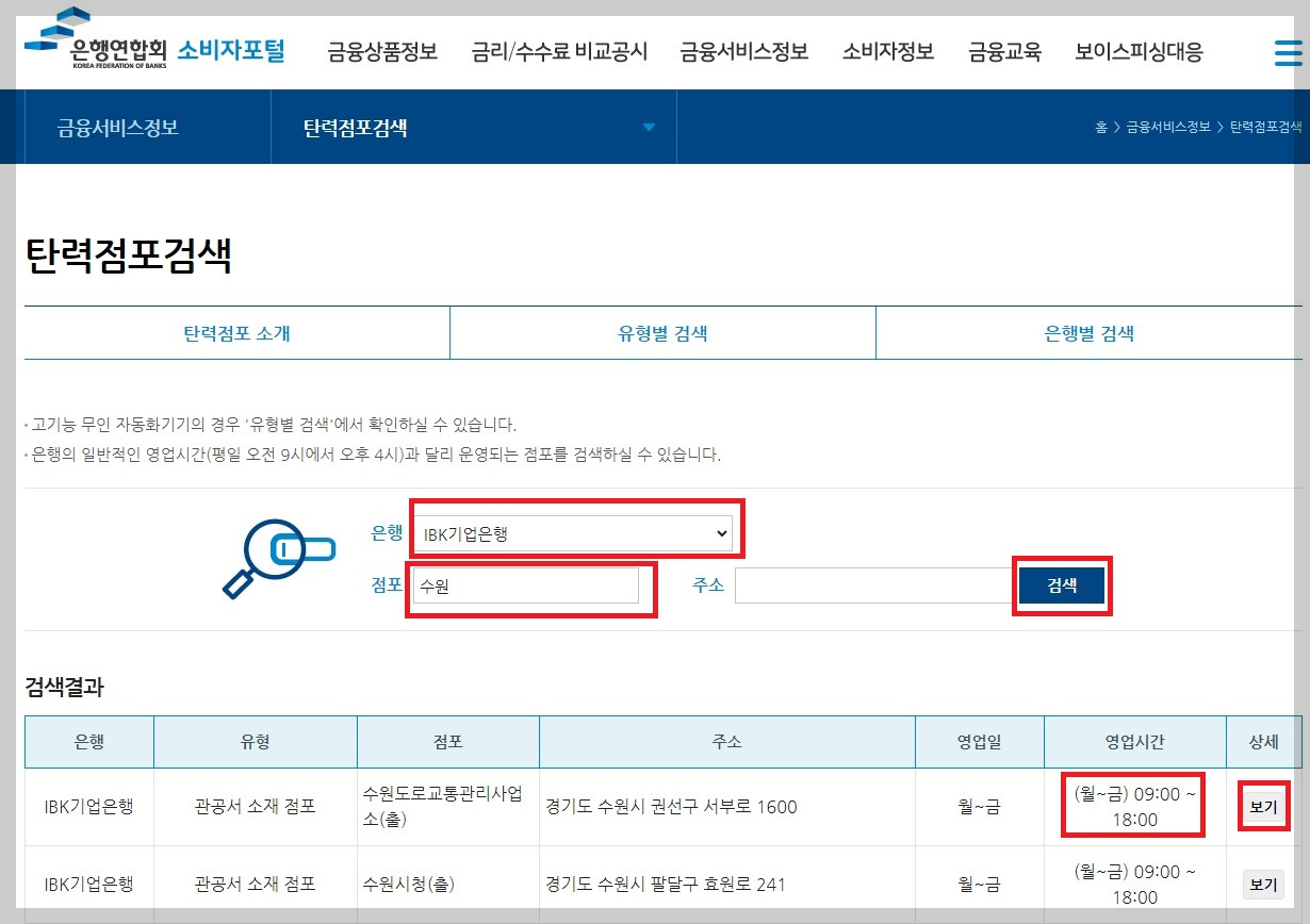위 링크를 들어가시면 아래와 같은 화면이 나옵니다. 이 곳에서 은행에 ibk 기업은행을 선택해 주시고 검색하시면 탄력점포의 위치를 확인하실 수 있습니다. 오후 6까지가 보통이지만 지점에 따라 다르기 때문에 확인해주셔야 합니다. 상세의 보기를 클릭하시면 더 자세한 지점의 정보를 볼 수도 있습니다.