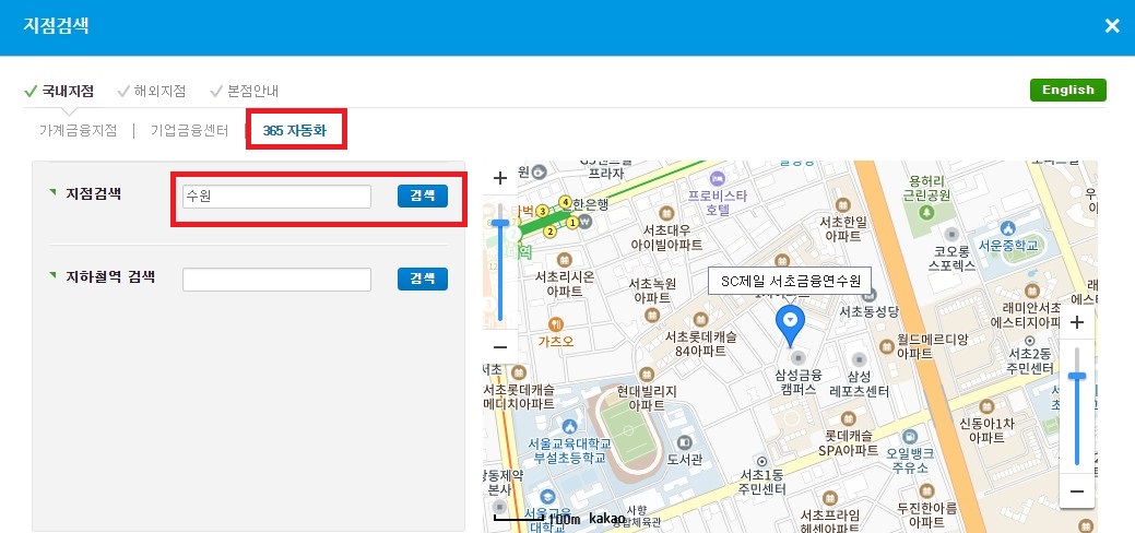 위의 사진과 같이 국내지점, 365 자동화 메뉴 선택하시고 지점검색 하시면 지역에 위치한 영업점 및 ATM기기 위치 및 기타 정보를 보실 수 있습니다.